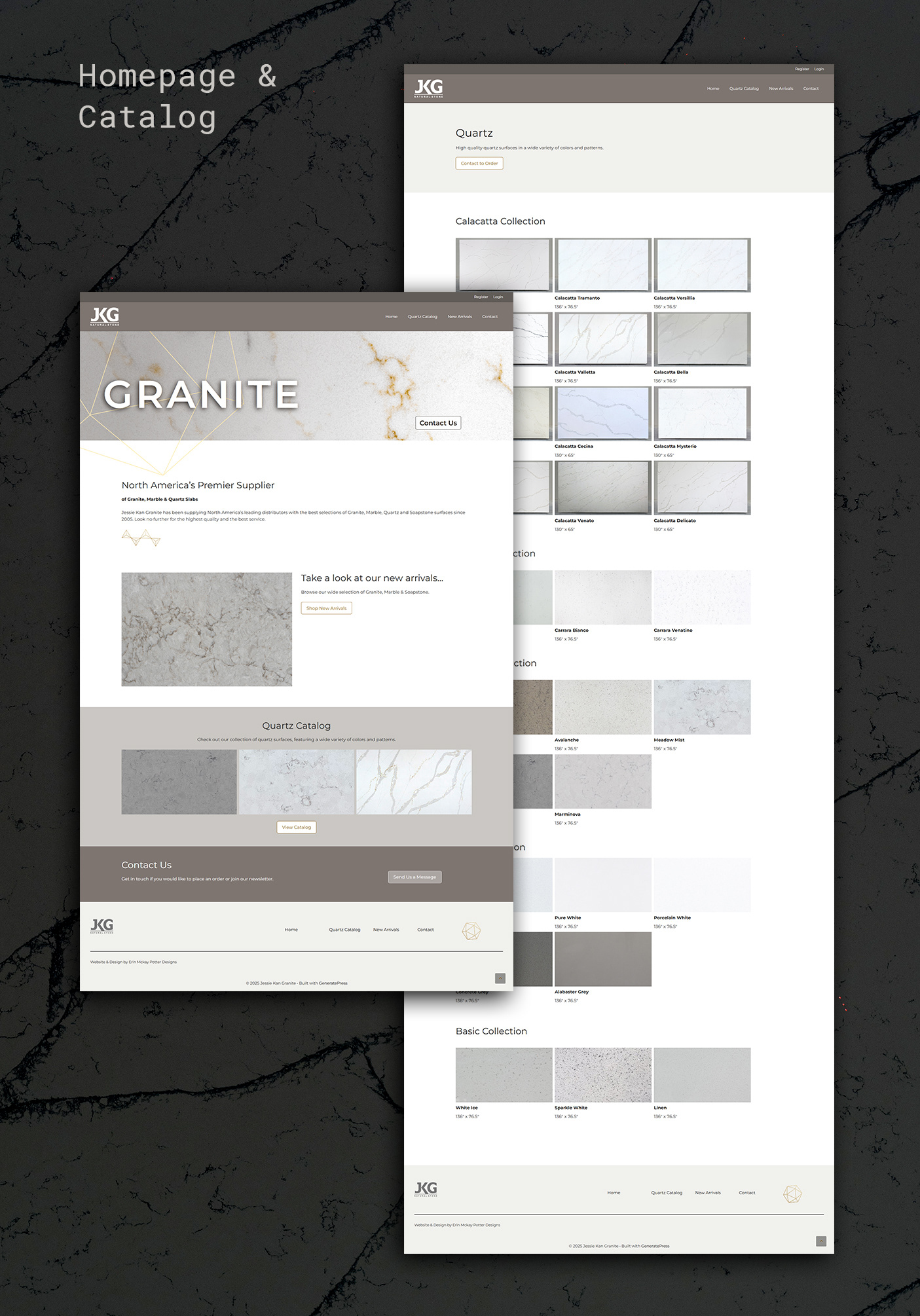 Jesse Kan Granite (JKG) is a stone countertop wholesale supplier based in Nashville, TN. They were looking for a website with a modern minimalist look to showcase their selection to their clients. Their brand uses subdued natural tones for a feeling of "quiet luxury".